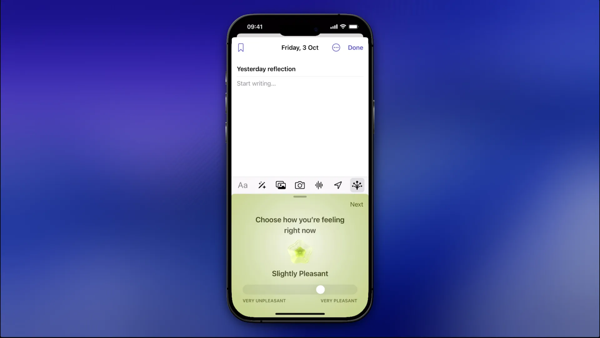 Reflectly is great for those who struggle with writing but still want to journal. It offers mood check-ins using emojis, letting you keep a journaling streak even on short or low-energy days.